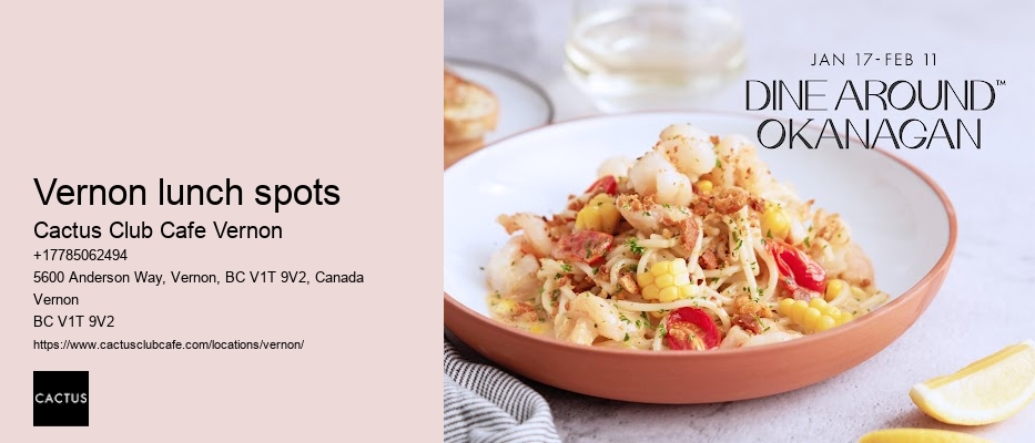 You'll find that the staff aren't just servers; they're knowledgeable guides who'll navigate you through the wine menu with ease. We believe in the power of fresh, high-quality ingredients to transform a meal from good to unforgettable. Text before the meta title text for each paragraph Vernon lunch spots Text after the meta title text paragraph Weekends tend to fill up quickly, so consider a weekday visit for a more intimate setting.